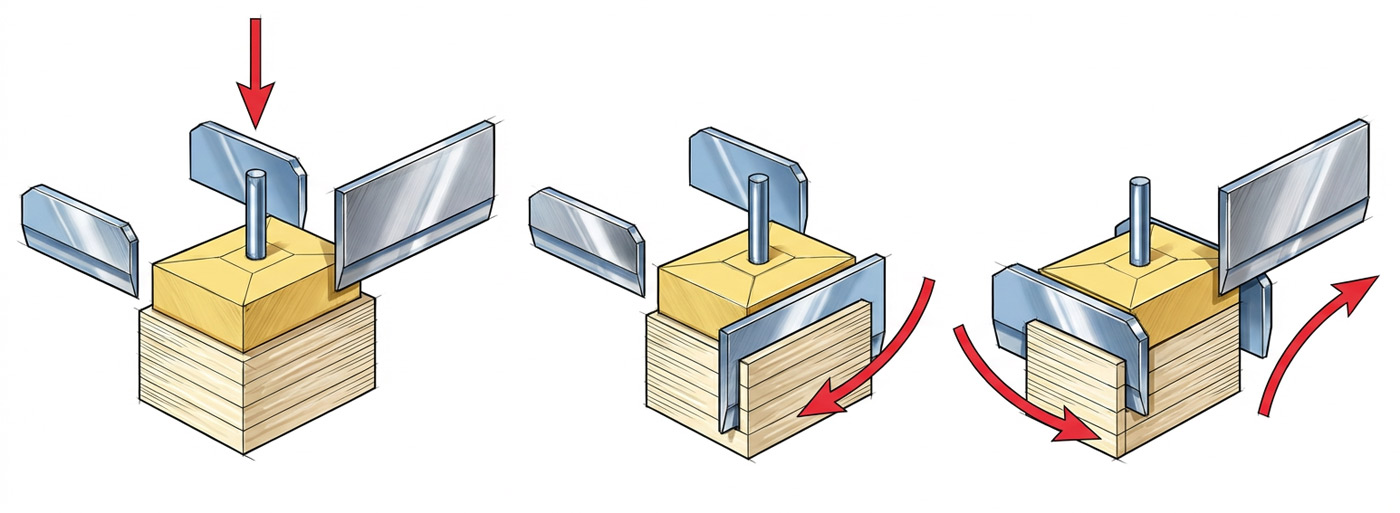 Jej nazwa pochodzi od trzech noży tnących jednocześnie trzy krawędzie arkusza: górną, dolną i boczną. Dzięki temu proces jest szybki, precyzyjny i zapewnia estetyczne, równe krawędzie publikacji.